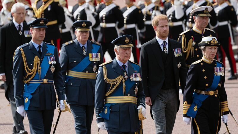 Photos: Thousands line procession route to honor Queen Elizabeth II (L-R) Prince William, Prince of Wales, Prince Richard, Duke of Gloucester, King Charles III, Prince Harry, Duke of Sussex and Princess Anne, Princess Royal follow the coffin containing Queen Elizabeth II as it is carried in a ceremonial procession from Buckingham Palace to the Palace of Westminster on September 14, 2022 in London, United Kingdom. Queen Elizabeth II's coffin is taken in procession on a Gun Carriage of The King's Troop Royal Horse Artillery from Buckingham Palace to Westminster Hall where she will lay in state until the early morning of her funeral. Queen Elizabeth II died at Balmoral Castle in Scotland on September 8, 2022, and is succeeded by her eldest son, King Charles III. (Carl Court/Getty Images)
