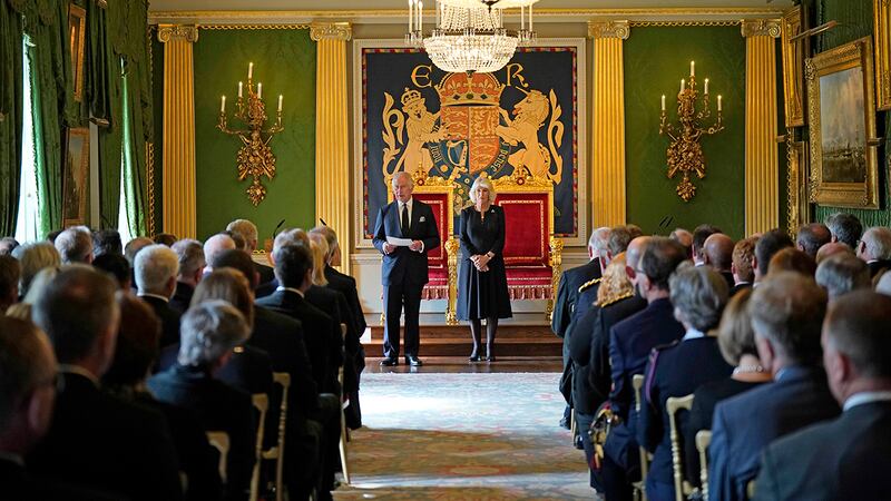 Photos: King Charles III visits Northern Ireland King Charles III, with the Queen Consort, speaks after receiving a Message of Condolence from Alex Maskey, the Speaker of the Northern Ireland Assembly, at Hillsborough Castle, on September 13, 2022 in Hillsborough, United Kingdom. King Charles III is visiting Northern Ireland for the first time since ascending to the throne following the death of his mother, Queen Elizabeth II, who died at Balmoral Castle on September 8, 2022. (Photo by Niall Carson - WPA Pool/Getty Images) (WPA Pool/Getty Images)