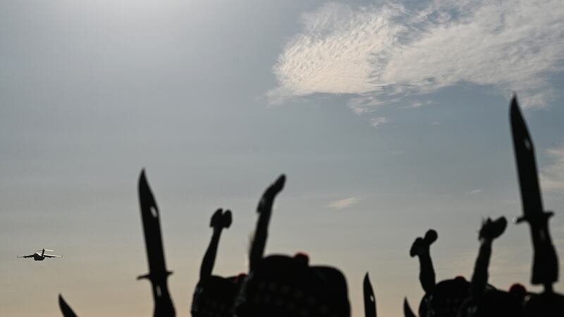 Queen Elizabeth II's coffin leaves Scotland for London Members of the Royal Regiment of Scotland stand on duty as the RAF C17 aircraft carrying the coffin of Queen Elizabeth II, takes off at Edinburgh airport on September 13, 2022 in Edinburgh, Scotland. The coffin carrying Her Majesty Queen Elizabeth II leaves St Giles Church travelling to Edinburgh Airport where it will be flown to London and transferred to Buckingham Palace by road. Queen Elizabeth II died at Balmoral Castle in Scotland on September 8, 2022, and is succeeded by her eldest son, King Charles III. (Photo by Paul Ellis - WPA Pool/Getty Images) (WPA Pool/Getty Images)