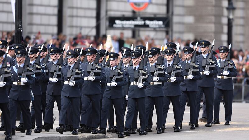 Photos: Crowds gather ahead of Queen Elizabeth II's coffin procession Members of the Royal Air Force are seen on parade during the procession for the Lying-in State of Queen Elizabeth II on September 14, 2022 in London, England. Queen Elizabeth II's coffin is taken in procession on a Gun Carriage of The King's Troop Royal Horse Artillery from Buckingham Palace to Westminster Hall where she will lay in state until the early morning of her funeral. Queen Elizabeth II died at Balmoral Castle in Scotland on September 8, 2022, and is succeeded by her eldest son, King Charles III. (Richard Heathcote/Getty Images)