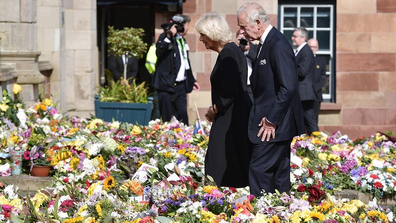 Photos: King Charles III visits Northern Ireland His Majesty King Charles III accompanied by Camilla, Queen Consort inspects the floral tributes left for his late mother Her Majesty Queen Elizabeth II outside Hillsborough Castle on September 13, 2022 in Hillsborough, Northern Ireland. King Charles III is visiting Northern Ireland for the first time since ascending to the throne following the death of his mother, Queen Elizabeth II, who died at Balmoral Castle on September 8, 2022. (Photo by Charles McQuillan/Getty Images) (Charles McQuillan/Getty Images)
