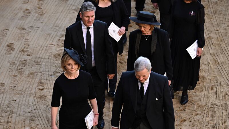 The Coffin Carrying Queen Elizabeth II Is Transferred From Buckingham Palace To The Palace Of Westminster Prime Minister Liz Truss (front L) and Lord True, UK leader of the House of Lords (front) and Leader of the opposition, Sir Keir Starmer attend the ceremonial procession of the coffin of Queen Elizabeth II from Buckingham Palace to Westminster Hall on September 14, 2022 in London, United Kingdom. Queen Elizabeth II's coffin is taken in procession on a Gun Carriage of The King's Troop Royal Horse Artillery from Buckingham Palace to Westminster Hall where she will lay in state until the early morning of her funeral. Queen Elizabeth II died at Balmoral Castle in Scotland on September 8, 2022, and is succeeded by her eldest son, King Charles III. (WPA Pool/Getty Images)