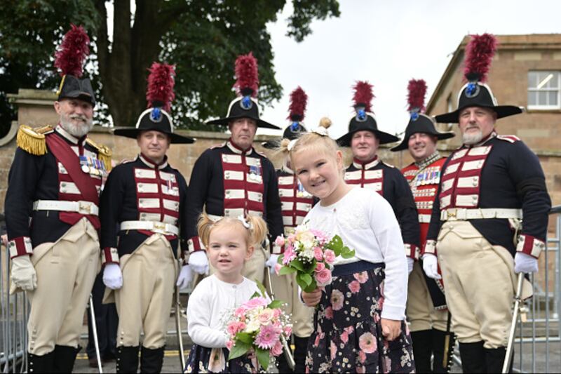 Photos: King Charles III visits Northern Ireland Two young girls pose with the ceremonial guards as they await the arrival of His Majesty King Charles III accompanied by the Queen Consort outside Hillsborough Castle on September 13, 2022 in Hillsborough, Northern Ireland. King Charles III is visiting Northern Ireland for the first time since ascending to the throne following the death of his mother, Queen Elizabeth II, who died at Balmoral Castle on September 8, 2022. (Photo by Charles McQuillan/Getty Images) (Charles McQuillan/Getty Images)