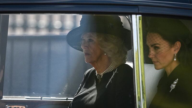 Photos: Thousands line procession route to honor Queen Elizabeth II (L-R) Camilla, Queen Consort and Catherine, Princess of Wales depart Buckingham Palace as the coffin of Queen Elizabeth II, adorned with a Royal Standard and the Imperial State Crown is pulled by a Gun Carriage of The King's Troop Royal Horse Artillery, during a procession from Buckingham Palace to Westminster Hall on September 14, 2022 in London, United Kingdom. Queen Elizabeth II's coffin is taken in procession on a Gun Carriage of The King's Troop Royal Horse Artillery from Buckingham Palace to Westminster Hall where she will lay in state until the early morning of her funeral. Queen Elizabeth II died at Balmoral Castle in Scotland on September 8, 2022, and is succeeded by her eldest son, King Charles III. (WPA Pool/Getty Images)