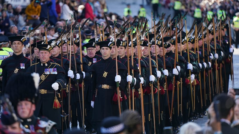 Queen Elizabeth II's coffin leaves Scotland for London A member of honour guard ahead of the coffin carrying Her Majesty Queen Elizabeth II leaving St Giles Church travelling to Edinburgh Airport on September 13, 2022 in Edinburgh, Scotland. The coffin carrying Her Majesty Queen Elizabeth II leaves St Giles Church travelling to Edinburgh Airport where it will be flown to London and transferred to Buckingham Palace by road. Queen Elizabeth II died at Balmoral Castle in Scotland on September 8, 2022, and is succeeded by her eldest son, King Charles III. (Photo by Carl Recine - WPA Pool/Getty Images) (WPA Pool/Getty Images)