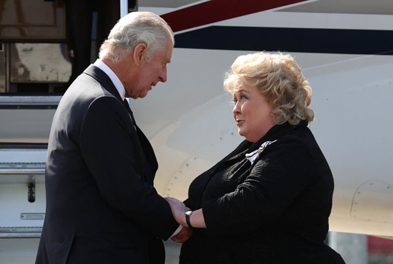 Photos: King Charles III visits Northern Ireland Lord Lieutenant of Belfast Fionnuala Jay-O'Boyle greets King Charles III as he arrives at Belfast City Airport in Northern Ireland as the King continues his tour of the four home nations on September 13, 2022, in Belfast, United Kingdom. (Liam McBurney - WPA Pool/Getty Images)
