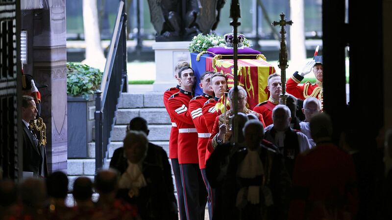 Photos: Thousands line procession route to honor Queen Elizabeth II Pallbearers from The Queen's Company, 1st Battalion Grenadier Guards carry the coffin of Queen Elizabeth II into Westminster Hall on September 14, 2022 in London, United Kingdom. Queen Elizabeth II's coffin is taken in procession on a Gun Carriage of The King's Troop Royal Horse Artillery from Buckingham Palace to Westminster Hall where she will lay in state until the early morning of her funeral. Queen Elizabeth II died at Balmoral Castle in Scotland on September 8, 2022, and is succeeded by her eldest son, King Charles III. (WPA Pool/Getty Images)