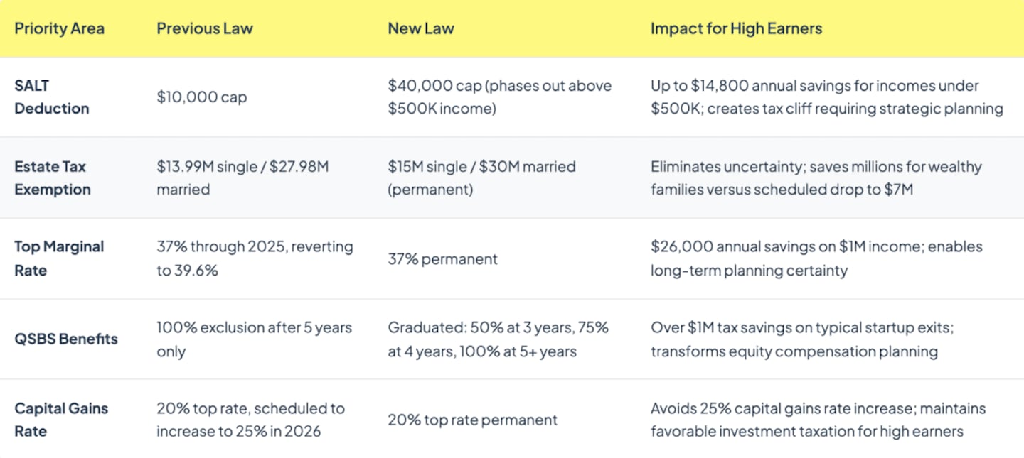Beyond the cash savings that come from paying income taxes at a lower rate, this change is helpful to those trying to optimize their tax efficiency because it offers more certainty. High earners can now structure compensation, retirement distributions, and business decisions around a known tax environment rather than planning for rate increases.