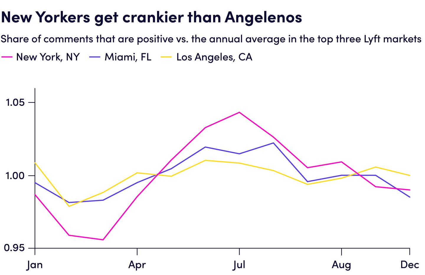 SAD is estimated to affect 5% of the U.S. adult population—and Lyft data would seem to confirm that. Riders are less likely to use positive words when reviewing their drivers during winter months, particularly in February, the month when SAD symptoms tend to peak in the U.S