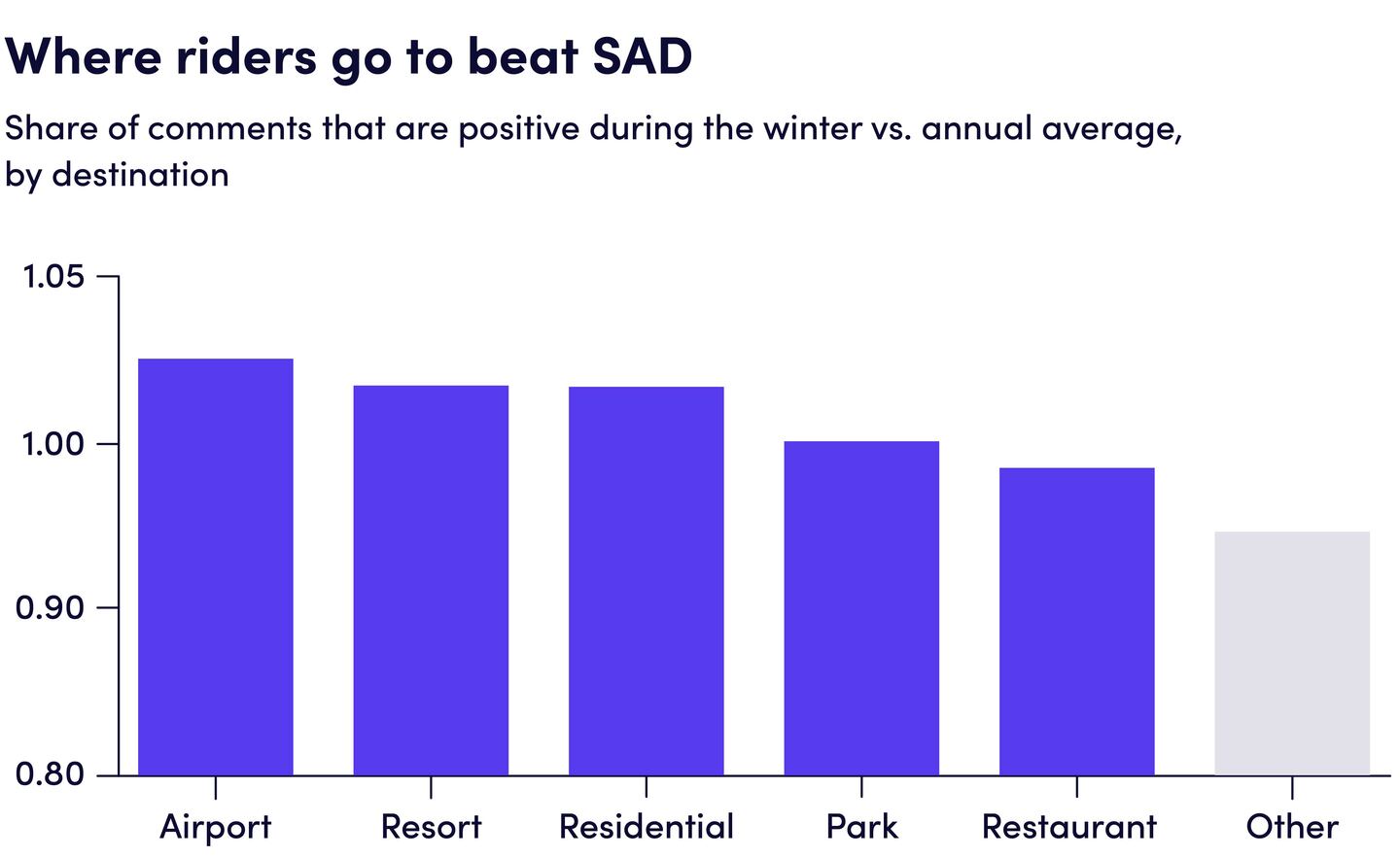 According to Lyft data, the answer is clear: Go on vacation! Riders going to the airport experience a 5% boost in sentiment. Sentiment is 4% higher for riders going to a resort. If that's not in the cards, Lyft data suggests boosting your mood by going to a friend's house or a park.