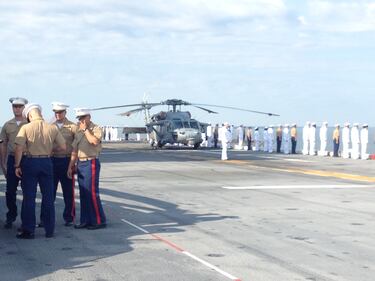 USS Iwo Jima homeport shift When leaving port, the colors (flag) shifts off the front of the ship (Stephanie Brown)