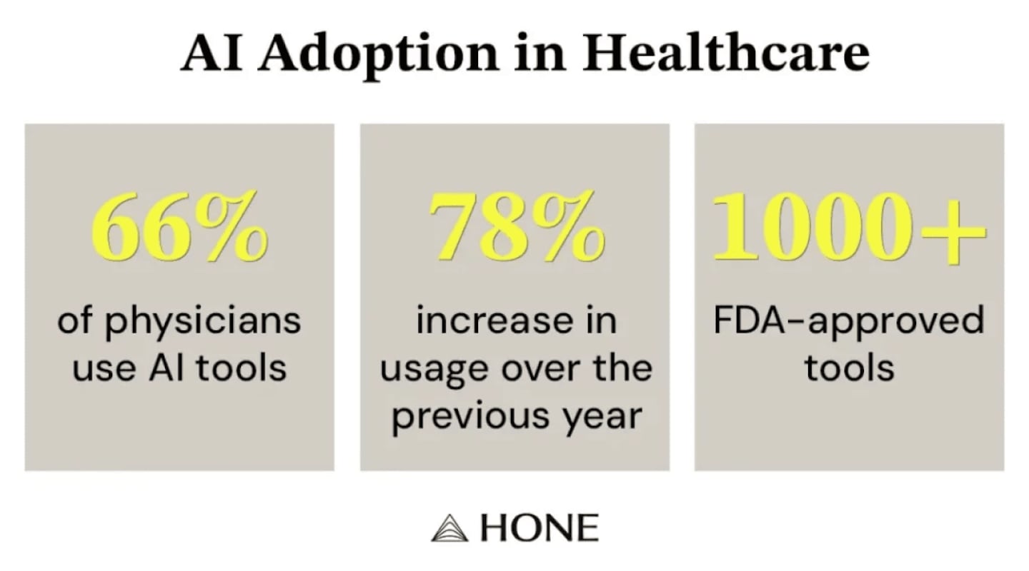 According to a 2025 American Medical Association survey, two-thirds of physicians use AI tools in their practice, a 78% increase from the year before.