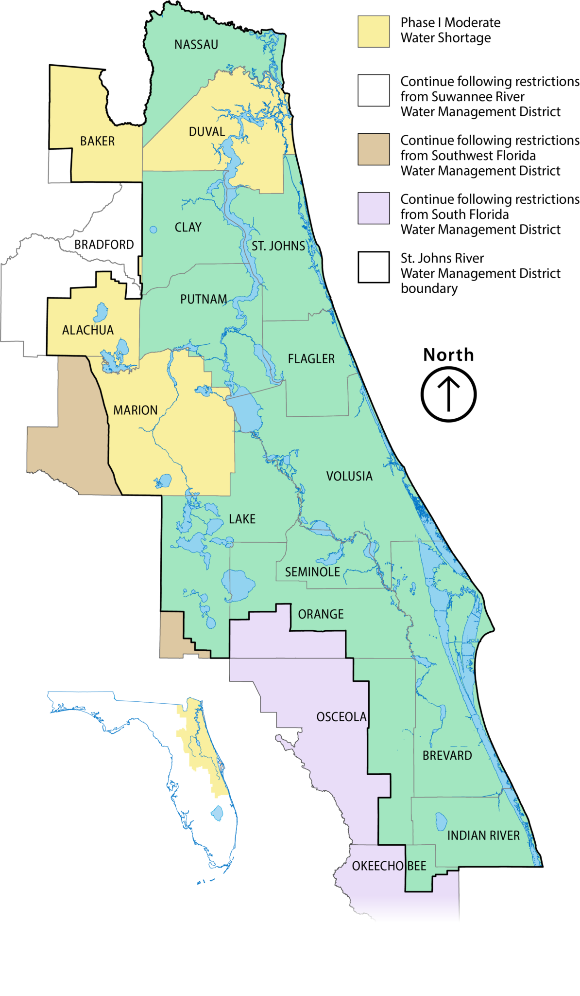 Water Shortage: The St. Johns River Water Management District (District) Governing Board voted to declare a Phase I Moderate Water Shortage for Duval County and portions of Alachua, Baker, Bradford and Marion counties.