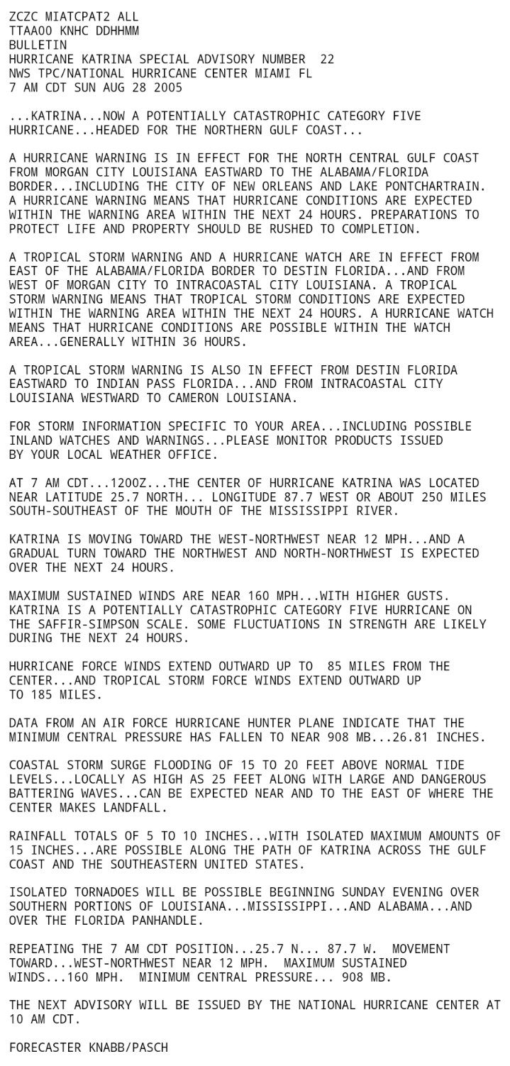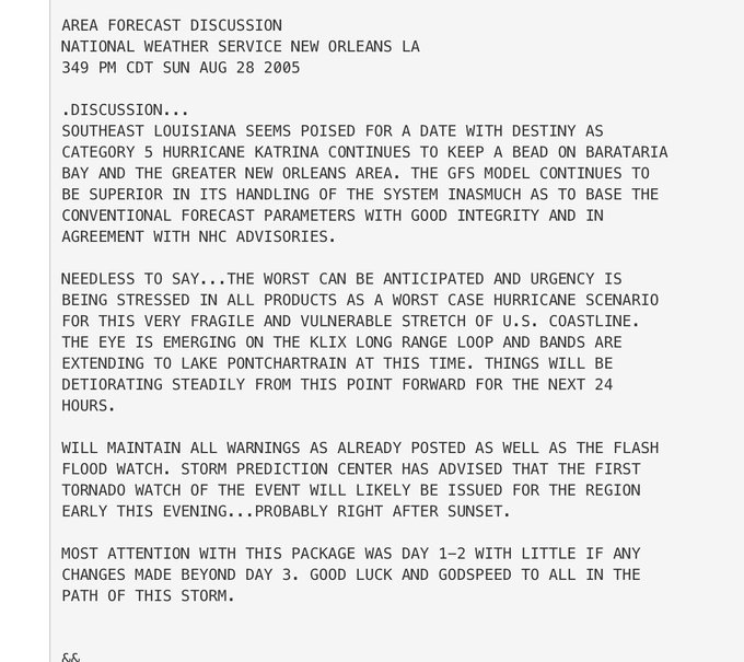 The New Orleans N.W.S. has a detailed post * here *... the NHC report * here *.... the Mobile N.W.S. summary * here *. New Orleans issued their infamous statement about the dangers of Katrina Sun. morning, Aug. 28:
