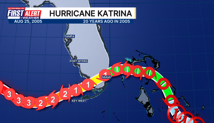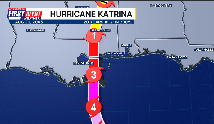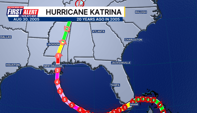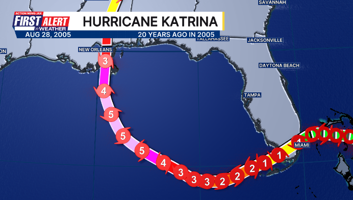 Aug. 29th marks 20 years since hurricane Katrina ravaged the Gulf Coast. Katrina first became a hurricane upon approach to the far SE Fl. coast when the eye of the then Cat. 1 moved right over the National Hurricane Center (sustained winds 69 mph, gusts to 87 mph) on Aug. 25th. Then - while moving southwest over the Southeastern Gulf - Katrina exploded into a Cat. 5. I can recall waking up early Saturday morning & being astonished at the monster in the Gulf then quickly trying to update “Talking the Tropics With Mike” (I had started the blog in late June/early July of that year). The next landfall was just east of New Orleans as an intense & - more importantly - large Cat. 3. The storm surge was extreme with as much as 30 feet of surge east of the eye that included debris from surge as far inland as I-10 in some spots! I was working here at Action News Jax at the time & can easily recall the details of forecasting the storm & its horrific landfall (there were no impacts to Jax/NE Fl./SE Ga). I’ve done follow-up reports from along the Gulf multiple times since 2005 including less than a year later, 5 years later & 10 years later. Several of my stories from 2015 below: