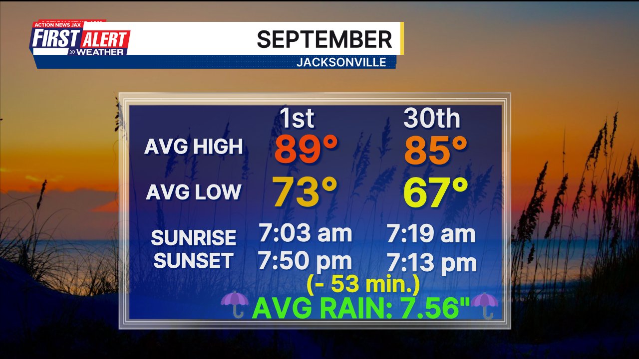 We turn the calendars to September(!) on Labor Day. It’s the last month of the “wet season” & we lose nearly an hour of daylight! Averages for Jacksonville: