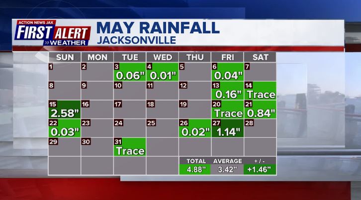 June is here! June marks the start of the NE Fl./SE Ga. “wet season” when more than half of the annual ~53″ of rain fall from June through Sept. thanks to a nearly daily active sea breeze + tropical waves, systems & cyclones. The averages for the month at JIA: